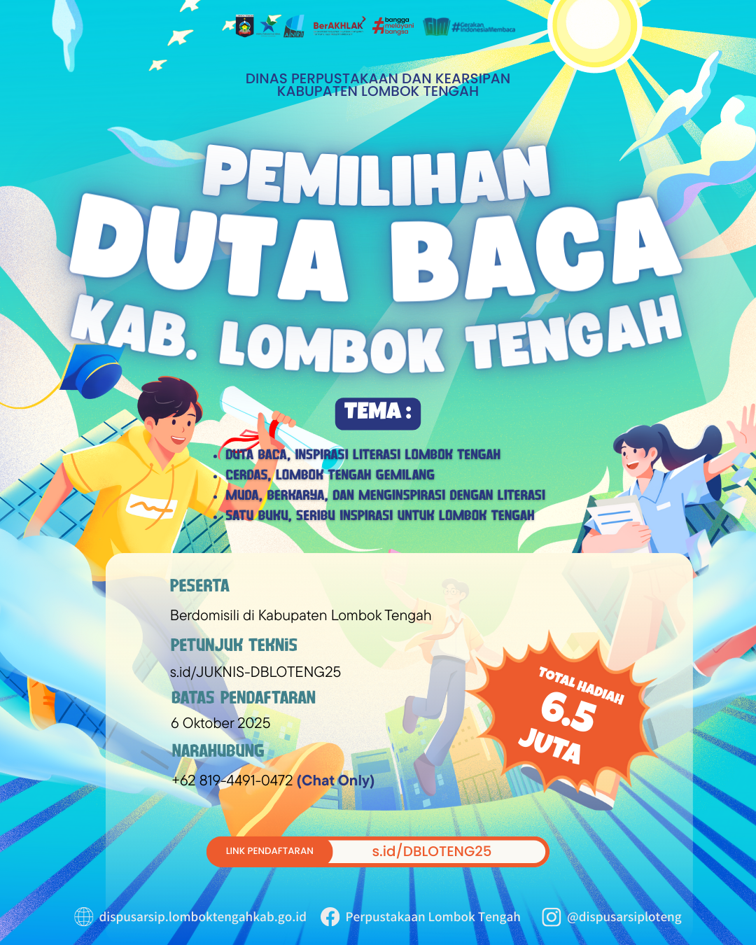 Dinas Perpustakaan dan Kearsipan Kabupaten Lombok Tengah kembali menyelenggarakan kegiatan Pemilihan Duta Baca Kabupaten Lombok Tengah Tahun 2025. Dengan pilihan tema :